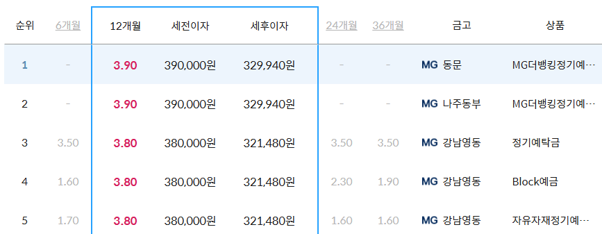 - MG 강남영동 정기예탁금: 3.80%, 세전 이자 380,000원, 세후 이자 321,480원