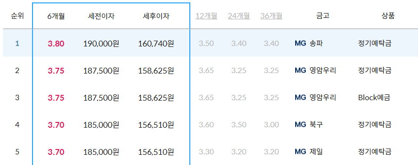 - MG 송파 정기예탁금: 3.80%, 세전 이자 190,000원, 세후 이자 160,740원