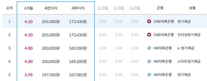 - OSB저축은행 정기예금: 4.10%, 세전 이자 205,000원, 세후 이자 173,430원