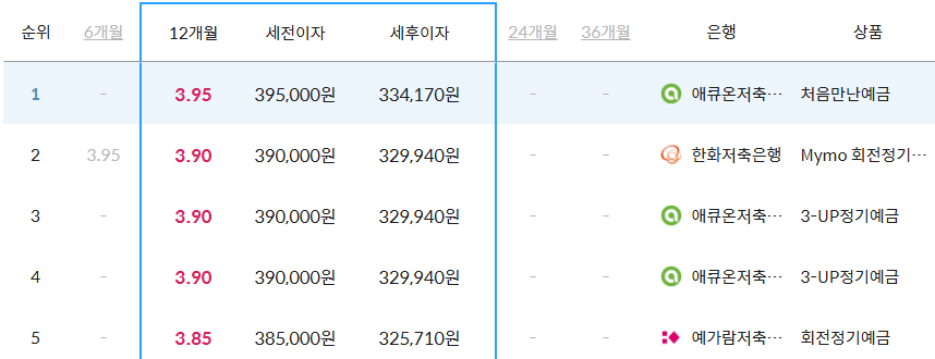 - 애큐온저축은행 처음만난 예금: 3.95%, 세전 이자 395,000원, 세후 이자 334,170원
